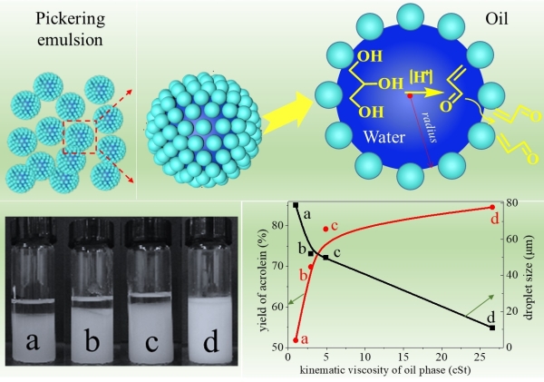 图1.Pickering乳液体系甘油脱水制丙烯醛反应路径及不同粘度的油相形成的Pickering乳液中丙烯醛的收率。a-d分别为正癸烷,十六烷,油酸乙酯和牡丹油