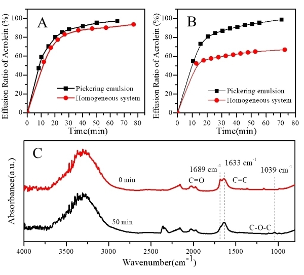 图2.丙烯醛在均相和Pickering乳液体系中的传质行为。(A)无甘油, (B)5wt.%甘油, (C)甘油与丙烯醛反应的原位红外光谱