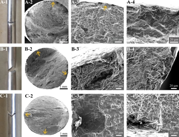 图2.保载疲劳3种失效模式。A-1~A-4:疲劳失效;B-1~B-4:延性失效;C-1~C-4:混合失效