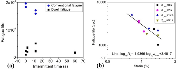 图3.(a)保载疲劳寿命与间歇加载时间关系;(b)保载疲劳寿命与第一周次累积最大应变关系