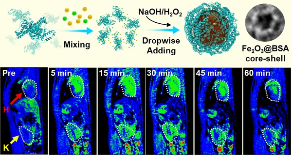 该研究中,研究人员基于牛血清白蛋白(BSA)自组装形成的笼状蛋白结构调控磁性纳米材料尺寸,在室温条件下,一步成功得到均匀、单分散、超小尺寸(3.5nm)的Fe2O3@BSA纳米颗粒,并确认了纳米颗粒表面笼状BSA超分子结构的存在。和Gd-DPTA相比,该纳米颗粒的T1造影效果更好、更持久;此外,得益于BSA的包覆,该纳米颗粒在体内可快速代谢经由尿液排出,具有较好的生物安全性,且制备方法简单高效,具有良好的应用前景。