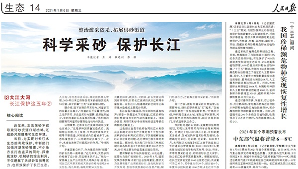 当前,为实现对长江水生态的有效保护,水利部门加强河湖采砂管理,围绕长江等大江大河,出台流域重要河段的河道采砂管理规划;各地在打击盗采的同时,多渠道拓展砂源,探索疏浚砂、机制砂的综合利用,确保采砂科学有序开展,不仅缓解了天然砂石供需压力,也有效保护了长江生态。据悉,目前长江流域采砂秩序总体平稳向好,河湖面貌明显改善。