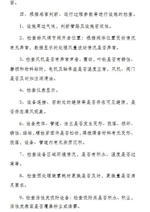 3、日常维护信息日常维护记录包括维护时更换的耗材(吸附材料、催化材料、过滤材料)、仪表校准、修复密封点的泄露及损坏部件、更换易耗件、保养风机、阀门和仪表、清理设备和设施内的粘附物和存积物等信息的记录。