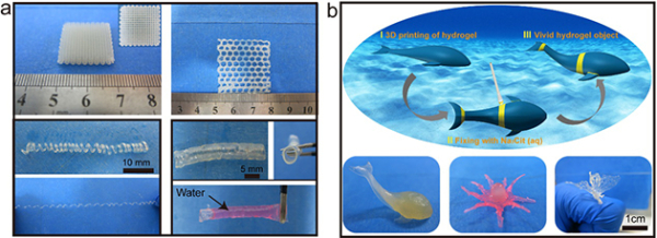 图3. (a)3D 打印水凝胶精细结构;(b)3D打印水凝胶二次塑形