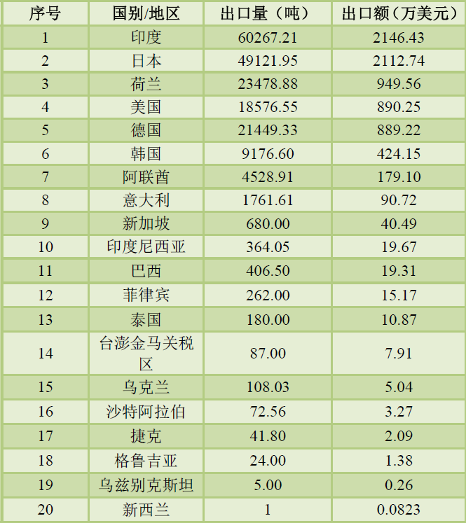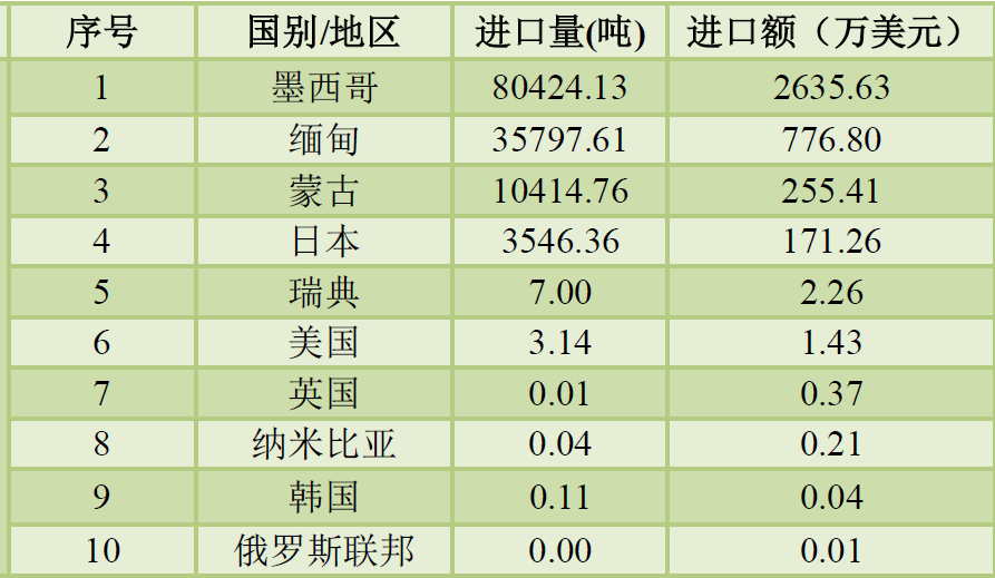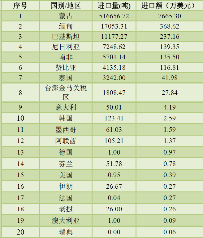 前三季度我国萤石出口总量为129328.81吨,总出口额为 4709.87万美元。其中按重量计氟化钙含量≤97%的萤石出口总量为73047.88吨,总出口额为2293.92万美元,按重量计氟化钙含量>97%的萤石出口总量为56280.93吨,总出口额为2415.95万美元。