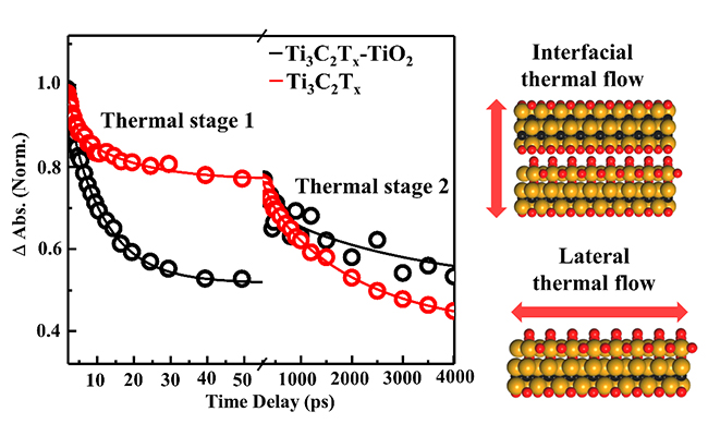 该团队通过飞秒超快光谱与分子动力学模拟发现,在Ti3C2Tx部分氧化后产生Ti3C2Tx-TiO2界面,该界面结构显著加速了界面间的热传递速率,但降低了面内的热扩散速率。分子动力学模拟阐明了Ti3C2Tx界面氧化几率对热传导速率之间的关系,从分子层次上解释化学键结构对热传导率的影响。该研究对于基于氧化物界面热管理和热调控的器件设计提供了研发思路。