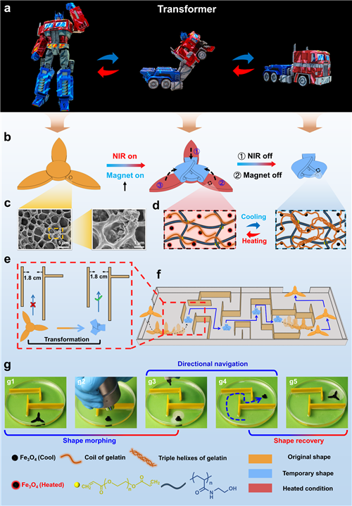 研究人员开发了一种新型光、热、磁控制的水凝胶“变形金刚”,具有非接触式形状操纵和定向导航特性(图1)。制备了具有化学交联聚(N-(2-羟乙基)丙烯酰胺)(PHEAA)和可逆交联明胶(Gelatin)网络的双网络结构水凝胶。明胶是动物胶原的水解产物,链段之间存在大量氢键,随着温度的变化,氢键不断断裂重组,使得明胶在单链和三重螺旋结构之间迅速转变。利用明胶的可逆转变,可以具备热响应形状记忆性能和自愈合能力。
