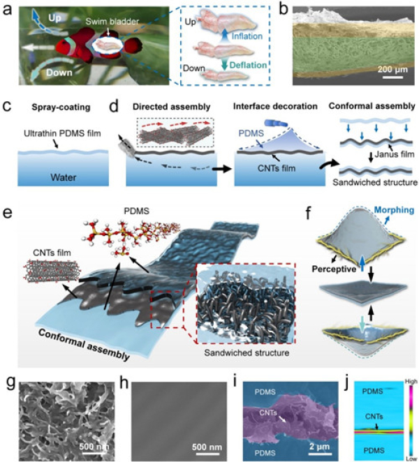 图1.(a)小丑鱼由鱼鳔充气/放气行为引起的上浮/下潜运动示意图;(b)真实鱼鳔经冷冻干燥后的SEM图像;(c-d)在空气/水界面制备超薄PDMS和CNTs/PDMS Janus膜的示意图,以及将二者集成为一个三明治自感知弹性复合膜(PCP)的制作过程示意图;(e)PCP膜的结构示意图;(f)驱动变形和传感的协同作用示意图;(g-h)CNT /PDMS Janus膜在分别水侧和空气侧的扫描电镜图;(i-j)PCP膜的截面扫描电镜图(i)和二维拉曼图(j)