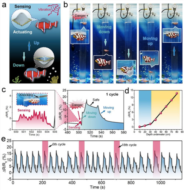 图2.(a)人工鱼鳔气动驱动器的示意图;(b)人工鱼鳔驱动器在下潜/上浮过程中的照片,箭头的方向表示运动的方向;(c)用人工鱼鳔去模仿鱼的感知及运动行为,当人工鱼鳔感受到外界的危险信号时,可以据此去引导和追踪其进一步的运动;(d)人工鱼鳔驱动器感知的水下位置;(e)人工鱼鳔驱动器在重复下潜/上浮过程中的实时信号记录