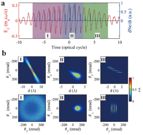 图2.电子在光场下相位分布图(a)与电子空间分布图(b)。图2展示了不同空间分布电子在光场相位下分布及空间分布。周期性发射的阿秒电子脉冲在激光场调制下形成了条纹结构分布,这一作用过程把电子按时间的先后顺序转换成了空间投影,根据电子空间分布可直接反演其阿秒时间动力学过程。