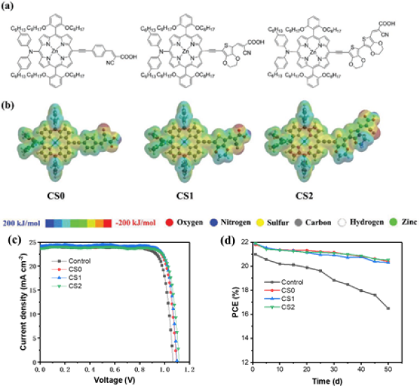 中国科学院功能纳米结构设计与组装/福建省纳米材料重点实验室研究员高鹏课题组针对钙钛矿太阳能电池表面缺陷和水分侵蚀导致的稳定性问题,开发出一系列D-π-A型卟啉分子,并在使用该卟啉小分子钝化钙钛矿表面缺陷作用机制的研究中取得重要进展。研究发现,以该系列卟啉分子CS0,CS1, CS2处理钙钛矿表面,可有效钝化钙钛矿表面缺陷,从而抑制perovskite/HTM界面间的非辐射复合;由于卟啉分子上疏水型长烷基链的存在,可有效阻挡空气中水分子的入侵。基于CS0,CS1,CS2钝化的钙钛矿太阳能电池,均表现出良好的湿稳定性和提升的器件性能;基于CS1钝化的器件,获得了22.37%的最高电池效率。测试表明,编号为CS0-CS2的卟啉材料上的氰基丙烯酸官能团成功钝化钙钛矿晶格表面和晶界的缺陷,从而提高器件的VOC和FF。