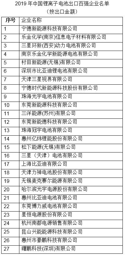 中国化学与物理电源行业协会根据海关统计数据,按出口金额评定发布了“2019年度中国锂离子电池出口百强企业名单”。