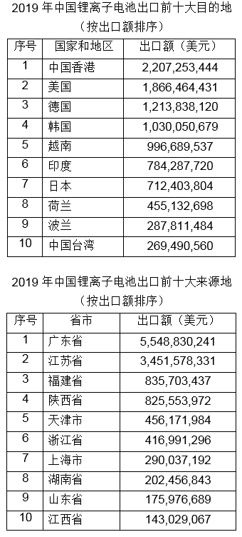 2020年12月1日,中国化学与物理电源行业协会根据海关统计数据,按出口金额评定发布了“2019年度中国锂离子电池出口百强企业名单”(名单不包括以锂离子电池模组为主的制造企业)。锂离子电池出口百强企业合计出口额为110亿美元,占2019年中国锂离子电池出口总额的84.4%。宁德新能源科技有限公司以23.5亿美元排名第一,占中国锂离子电池总出口额的18%。乐金化学(南京)信息电子材料有限公司以15.89亿美元位居第二,占总出口额的12.2%。三星环新(西安)动力电池有限公司以7.46亿美元位列第三,占总出口额的5.7%。2019年中国锂离子电池出口百强企业入围门槛超过398万美元。