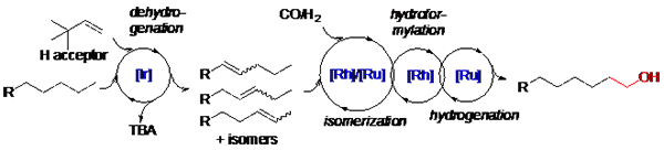 机理研究表明,金属铱催化剂作用于烷烃脱氢并与随后的反应气体CO作用失活。这避免了后续铱络合物引发的烯烃双键氢化等副反应。金属铑作用于烯烃异构——氢甲酰化过程。金属钌作用于决速步的氢化过程,并扮演了促进烯烃异构的角色(图1)。该三金属——四重催化体系不仅可实现直链烷烃到直链醇的转化,还可用于以α-烯烃为起始原料,制备重要的α, ω-双醇(图2)。