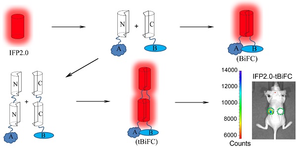 蛋白质之间相互作用驱动众多的生物学过程,如基因调控、细胞信号转导、生物大分子合成与转运等。监测活体或细胞中的蛋白质相互作用成为解析生物学过程和理解疾病发生发展机理的一种基本手段。双分子荧光互补系统(BiFC)广泛用于相关研究,但早期发展的BiFC主要是基于绿色荧光蛋白(GFP),在此波段范围,存在两个问题:一是许多细胞能产生较强的背景荧光;二是生物组织对荧光信号有比较强的吸收。研究团队随后发展了一系列红色、远红和近红外BiFC,但光量子产率不同程度下降。针对这些问题,该研究以近红外光敏色素蛋白IFP2.0为材料,通过串联构建的方式,发展了荧光互补效率显著提高的近红外串联荧光互补系统(tBiFC)。与已有的近红外荧光互补系统相比,此tBiFC系统在动物活体和活细胞内成像蛋白质相互作用(强相互作用、弱相互作用)时,荧光信号强度分别增加了1.48和400倍。该新方法有利于活细胞和活体内蛋白质相互作用研究。