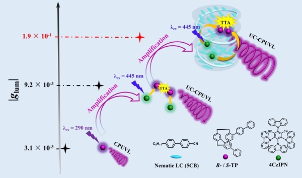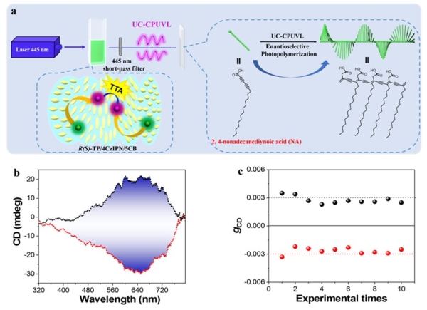 近期,国家纳米科学中心研究员段鹏飞课题组构筑了一个基于三重态-三重态湮灭上转换发光的手性向列相液体系,实现了发光圆偏振度的逐级放大,获得了圆偏振度约为0.2的体系,并且实现了由可见光到紫外光的上转换圆偏振紫外发光(Upconverted circularly polarized ultraviolet luminescence,UC-CPUVL)。研究人员进一步将其产生的上转换圆偏振紫外光应用于联乙炔的聚合反应中,得到了光学活性高度可控且稳定的手性聚联乙炔。
