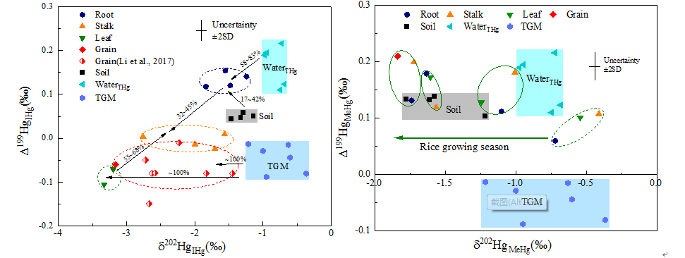 图2.水稻植株各部位和大气、土壤、灌溉水的无机汞(左)和甲基汞(右)汞同位素分馏特征