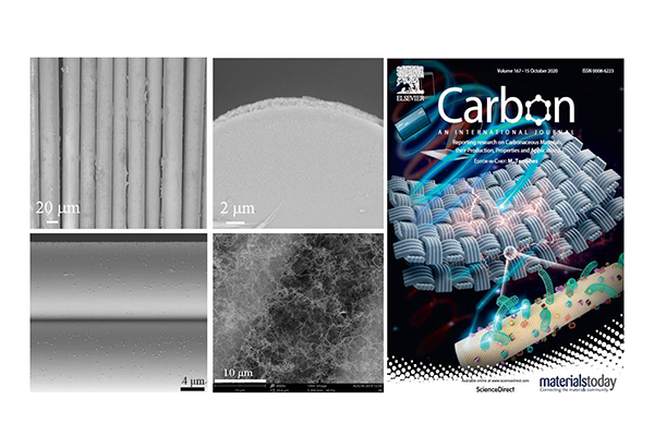 此外,该研究以玄武岩纤维织物为原料,在无外加催化剂条件下通过化学气相沉积法在其表面直接生长碳纳米管,并以该纤维材料作为增强相,与高分子基体进行有效复合,制备出高分子纳米复合材料,研究复合材料的电磁屏蔽性能。结果显示,玄武岩纤维在高温下表面会析出尺寸在10-100 nm的纳米颗粒,并随处理温度的升高,纳米颗粒的结晶度也明显提高。在高温条件下,析出的纳米颗粒可作为催化剂实现碳纳米管的原位可控生长。碳纳米管在玄武岩纤维织物上的直接生长,解决了纳米颗粒在高分子基体中难分散、易团聚等问题,为高效制备纳米复合材料提供新方法。对纳米复合材料电磁屏蔽性能机理研究发现,复合体系中具有的纳米-微米多层结构提高了电磁波在材料内部的多重反射几率,材料内部通过电荷传输、偶极子极化、电容双电层结构等对电磁波的吸收以及多重反射所产生的协同效应,使得纳米复合材料具有较好的电磁屏蔽性能。相关研究成果发表在Carbon上,并被选为该杂志第167期封面。