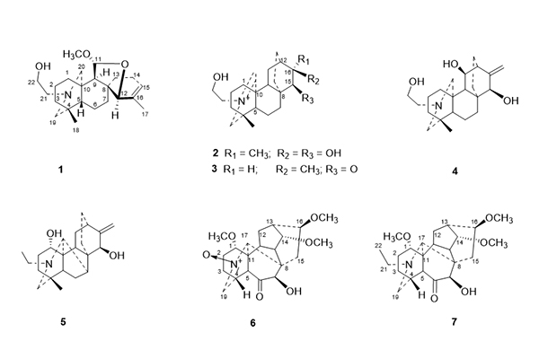 近日,中国科学院新疆理化技术研究所民族药研究创新团队研究员阿吉艾克拜尔·艾萨课题组从新疆分布的牛扁全草中发现7个新化合物(1-7)。其中,化合物Barpuberudine (1)是新骨架类型C20-二萜生物碱,化合物barpubenines A(6)和B(7)是重排型C18-二萜生物碱。