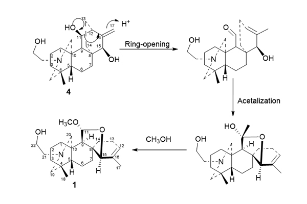 通过HR-ESI-MS、1D和2D NMR等波谱数据分析,确定了新化合物1-7的平面结构及相对构型,化合物1是一个具有新颖骨架的C20-二萜生物碱,推测其生源途径为,化合物Barpuberudine D(4)作为前体化合物,经C-11和C-12键的断裂开环和C-9位的异构化,再经缩醛化和O-甲基化得到1(图2)。筛选新化合物1-7对A-549和Hela2种癌细胞株的细胞毒性,结果显示,所有化合物均未显示出明显的细胞毒性(IC50>50μM);测定新化合物对白色念珠菌(ATCC 10231)、大肠杆菌(ATCC 11229)和金黄色葡萄球菌(ATCC 6538)的抗菌活性,结果显示,化合物1、4和7对金黄色葡萄球菌有不同程度的抗菌活性,化合物4对白色念珠菌有一定的抗菌活性。该研究丰富了二萜生物碱的化学结构多样性,并为进一步开发利用新疆特色乌头属植物资源奠定基础。