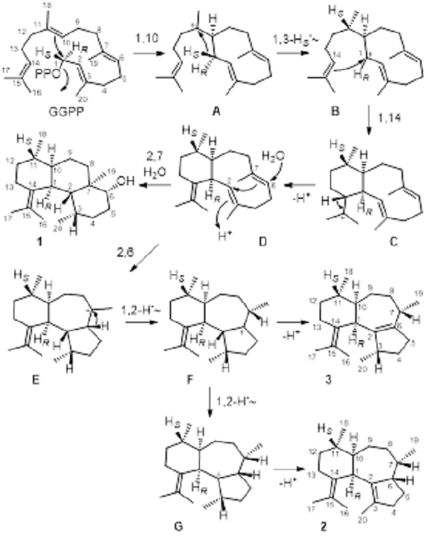 图2.在二萜合成酶(CaCS)的作用下,GGPP形成新型二萜分子1-3的环化过程