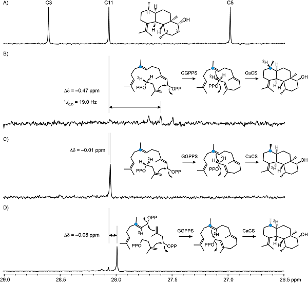 图3.13C-NMR 谱图,A) 1,B) 2,C) 3,and D) (1-13C)GGPP与CaCS孵育的同位素标记实验结果。圆圈代表13C标记