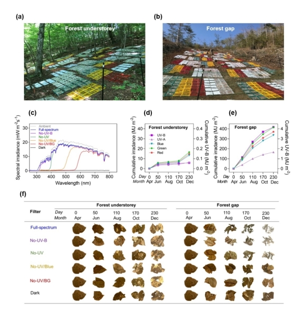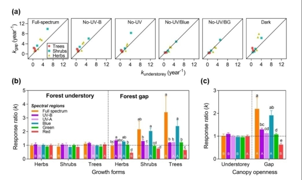 为解决这一问题,中国科学院沈阳应用生态研究所与日本国家森林综合研究所合作,采用析因设计方法,系统性地分析了太阳辐射在温带森林林下及相邻的采伐林窗处叶片凋落物分解的相对影响。利用自主设计的光谱分解盒(约2400个,占地面积约500m2),对地面太阳光谱进行衰减过滤处理,从而量化主要光谱分区(包括UV-B、UV-A、蓝光、绿光和红光)对光降解的相对贡献(图1)。通过对不同功能组(乔木、灌木、草本)的12种常见植物,进行沿冠层物候梯度采样,能够确定光降解在功能组间的差异。同时测定凋落物的12种典型功能性状,寻找能够预测光降解作用的凋落物特性。结果表明,在林窗全光谱的强太阳光下,损失率增加了近120&,而蓝光贡献了损失率的75%(图2),说明光降解主要由蓝光驱动。将这一结果扩展到整个森林生态系统,在冠层开度为20%的模拟情景下,落叶后1年间的光降解作用会增加落叶中13%的碳损失。研究还发现,无论何种光谱下,草本和灌木凋落物的质量损失率均高于树木凋落物;在林窗处更加显著。凋落物初始的木质素和多酚含量分别预测了蓝光和UV-B辐射的光降解作用。这些结果表明,在森林生态系统中,由于森林管理和土地利用变化而造成的采伐、以及自然灾害形成的林窗,不仅影响凋落物量,更重要的是改变了凋落物在太阳光下的暴露程度,从而加速了碳循环。这些发现拓宽了人们对光降解理解的范畴,即光降解不仅推动干旱生态系统碳动力学,在太阳辐射到达的其他陆地生态系统也无处不在。更重要的是,这为陆地生态系统碳氮循环模型提供了新参数,从而能够准确预测生物地球化学循环对未来全球变化的响应。
