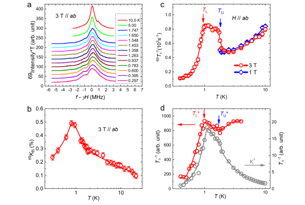 (a)TmMgGaO4单晶在3T的面内磁场下,69Ga元素在不同温度下的NMR谱;(b)NMR超精细移动69Kn随温度的变化关系;(c)NMR自旋-晶格弛豫率1/69T1随温度的变化关系;(d)量子蒙特卡洛对1/69T1数据模拟的计算结果
