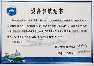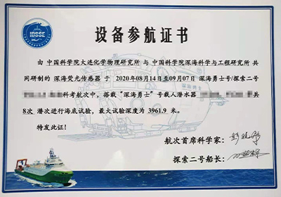 有色溶解有机物(chromophoric dissolved organic matter,CDOM)是存在于各类水体中的含有腐殖酸、富里酸、氨基酸和芳烃聚合物等物质的溶解性有机物。开展CDOM分布研究能够更好地确定其来源及组成,对揭示海洋碳循环变化规律和海洋生态系统特征有重要意义。在本航次海试中,深海原位CDOM荧光传感器以及新型超高灵敏度深海原位叶绿素a荧光传感器分别测量到了某海域从海平面到海底整个剖面的CDOM和叶绿素a的浓度,为海洋生物、物理海洋等学科研究提供了重要数据。两类荧光传感器均采用行业认可的标定方法,经比对,测量结果与文献报道的船载光谱仪对该海域的测量数据相吻合,包括剖面浓度变化趋势、拐点深度和绝对浓度,证明了两类荧光传感器的测量及标定准确性。经权威部门第三方测试,CDOM传感器检测下限为8.5ng/L硫酸奎宁,叶绿素传感器检测下限为0.42ng/L叶绿素a,检测灵敏度均比可查询的美国、德国等进口同类产品高数倍。两类深海原位荧光传感器已作为中科院A类先导专项“深海/深渊智能技术及海底原位科学实验站”的首批成果,搭载到深海原位实验站上。