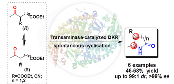 中国科学院天津工业生物技术研究所研究员朱敦明、吴洽庆带领的生物催化与绿色化工团队,通过对实验室酶库的筛选,获得高立体选择性的ω-转氨酶,这种酶不仅催化不对称C-N键的形成,而且可识别a-C的手性,利用ω-转氨酶对酮酯羰基α-C的立体识别,通过自发原位环化反应,实现双手性中心γ-或δ-内酰胺的精准构筑,收率46-68%,ee值大于99%,非对映异构体比例达99:1。该研究为不对称合成两手性中心的γ-或δ-内酰胺提供一种新的化学-酶催化“一锅法”策略。