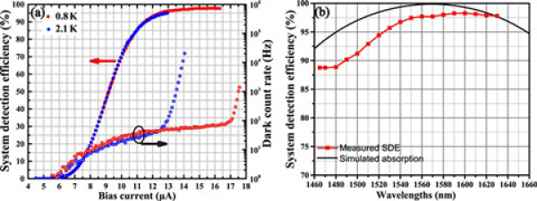 100%系统探测效率(SDE)是单光子探测器发展的最终目标,在量子基础理论验证和量子信息科技中具有应用价值。SNSPD凭借高探测效率、低暗计数、低时间抖动等性能指标,在量子通信、量子计算、深空光通信、生物荧光成像等领域发挥重要作用,推动了量子信息技术和其他前沿科学的发展。对SNSPD来说,实现100%效率的关键难点在于,需同时实现接近100%的本征探测效率和吸收效率。由于二者之间的纠缠制衡关系,相比于其他低Tc的超导材料(如WSi),高Tc的NbN材料SNSPD实现高SDE的难度更大。2017年,研究人员通过工艺优化,首次报道了基于小型闭合循环制冷机,2.1 K工作温度下,NbN-SNSPD系统探测效率(1550 nm工作波长)可超过90%;2019年,研究人员发明了离子注入等手段,首次打破了NbN本征探测效率和吸收效率的制衡关系,再次实现了90%探测效率SNSPD器件,为极限效率探测研究奠定基础。