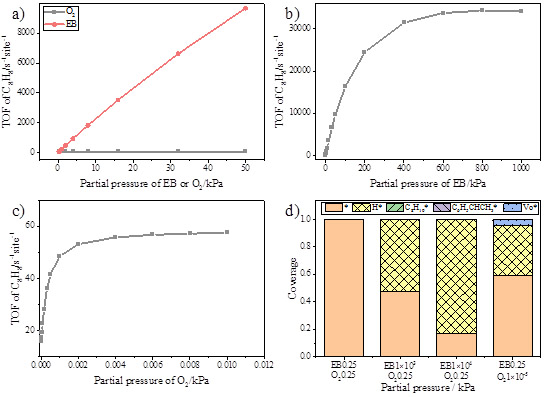 图二、不同条件下苯乙烯的生成速率以及相关主要物种的分布。a) 乙苯或氧气分压为0.25kPa时,另一气体分压在0到50kPa变化时反应的速率,b) 氧气分压为0.25kPa时,乙苯分压在0到1000kPa变化时反应的速率,c) 乙苯分压为0.25kPa时,氧气分压在0到0.01kPa变化时反应的速率,d) 不同分压下主要的吸附物种分布