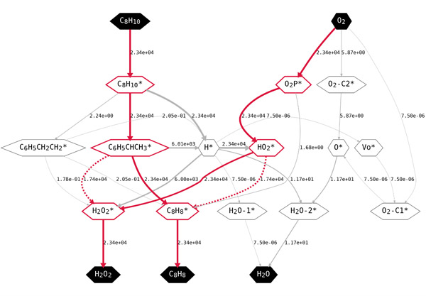 图三、反应网络及800 K, 1 bar EB, 1 bar O2条件下的物种转换速率。红色高亮部分为关键中间物种与反应路径,其中虚线表示自由基反应路径,线右侧的数字为物种转换的速率