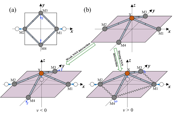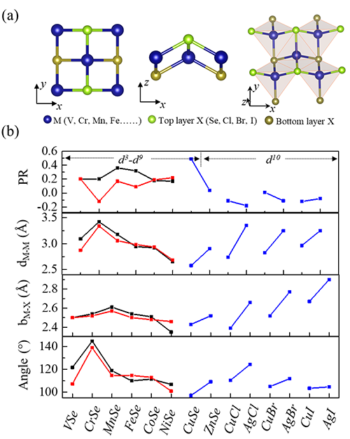 近日,中国科学院物理研究所/北京凝聚态物理国家研究中心纳米物理与器件实验室N11组副研究员潘金波、博士张艳芳、研究员杜世萱,与美国天普大学教授严琪闽等合作,在二维层状材料及异质结的新奇物性研究中取得进展。研究人员设计出正方形晶格结构在应力下的演化模型,通过分析二维平面结构和起伏结构在应力下可能的演化过程,提出一个能够使材料产生负泊松比的机制,即材料具有起伏结构,且次近邻原子间相互作用较弱(图1)。结合大数据挖掘和高通量计算,科研人员从二维材料数据库中搜索到一个具有类似模型结构的二维材料家族,即具有p4mm二维空间群的过渡金属硫族和卤族化合物MX,其中M为V、Cr、Mn、Fe、Co、Ni、Cu、Zn、Ag,X为Se,Cl,Br,I(图2)。理论计算表明,当金属原子3d轨道满占据时,体系具有较弱的次近邻相互作用,导致负泊松比的发生,与模型预测结果一致。研究中结构模型演化分析结合大数据材料挖掘的方式,提高了二维负泊松比材料的探索效率,为研究具有优异力学性质的二维材料提供了有价值的参考。相关研究成果发表在npj Computational Materials, 6, 154 (2020)上。