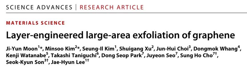 韩国亚洲大学Jae-Hyun Lee,韩国国立木浦大学Seok-Kyun Son,韩国Samsung Display公司的Sung Ho Cho等人提出了一种针对石墨烯的分层工业剥离技术(LEE),该技术不仅能够获得高达毫米级别的大尺寸石墨烯,而且还可以进行选择性的厚度控制。在石墨上蒸发的金属薄膜会引起张应力,使得金属薄膜的剥落诱导石墨烯的剥落,其中石墨烯剥落层的数量可通过使用不同的金属膜来调节。作者对所得石墨烯进行了详细的光谱学和电子传输测量分析,证明了所提出的剥落技术同时保障了石墨烯的质量和产量。该分层工业剥离可以为电子和光电子领域中石墨烯和其他二维材料的大规模制造工艺的开发铺平道路。该研究以题为“Layer-engineered large-area exfoliation of graphene”的论文发表在《Science Advances》上。