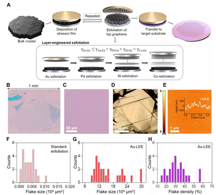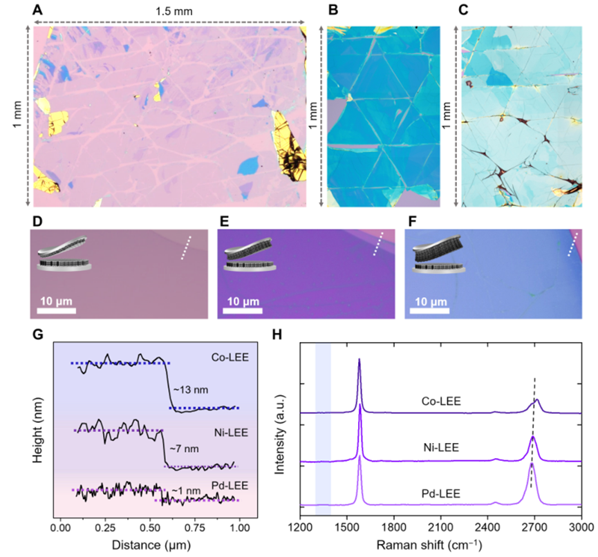 为了验证通过调整剥离深度能获得不同层数的石墨烯,作者在石墨薄片上沉积了各种金属膜作为不同的应力源。作者选择了Pd、Ni和Co,其中γPd-Gr= 84 meV /原子,γNi-Gr= 125 meV /原子,而γCo Gr = 160 meV /原子。当使用Pd膜剥离天然石墨时,能得到双层石墨烯(图2A)。用Ni和Co膜剥落也会产生均匀的多层石墨烯,其横向尺寸为几百微米(图2B和C)。作者通过原子力显微镜分析证实,Pd、Ni和Co膜的剥落可分别得到双层、少层(7 nm)和多层石墨烯(13 nm)(图2G)。由此可见,剥落的石墨烯层数随着应力源剥离深度的增加而增加,以此可实现不同层数石墨烯的可控剥离。