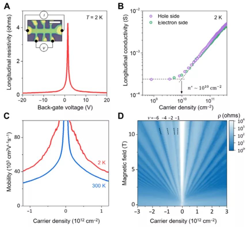 图3A显示了LEE单层石墨烯的拉曼光谱,其中G和2D峰清晰可见,且不存在与无序度相关的D峰,结果表明Au-LEE获得的单层石墨烯具有较高的质量。AFM测量表明,石墨烯表面上没有明显的物理缺陷(图3D),其均方根粗糙度与硅基底上的正常剥落石墨烯的均方根粗糙度相同(相差约0.8Å)。XPS光谱结果显示,在整个LEE过程中,石墨烯表面不会受有机残留物的侵蚀。为了进一步检验石墨烯的质量,作者在单层石墨烯器件上进行了电子传输测量。图4A表明该石墨烯中仅存在可忽略不计的带电杂质和应变。单层石墨烯器件的电子迁移率比硅片上剥落的石墨烯的迁移率还要高,接近先前报道的优质石墨烯器件的迁移率(图4C)。因此,光谱分析和电子传输结果表明,通过LEE技术得到的毫米级石墨烯同时具有高质量。