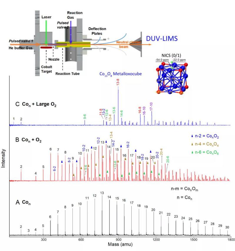 A为纯的中性Con团簇质谱分布;B/C为Con团簇与中量及大量氧气反应后质谱分布;插图为仪器制样方法与Co13O8氧立方的NICS芳香性描述