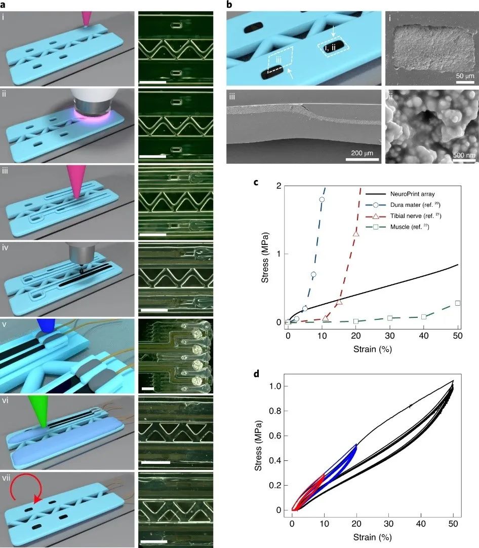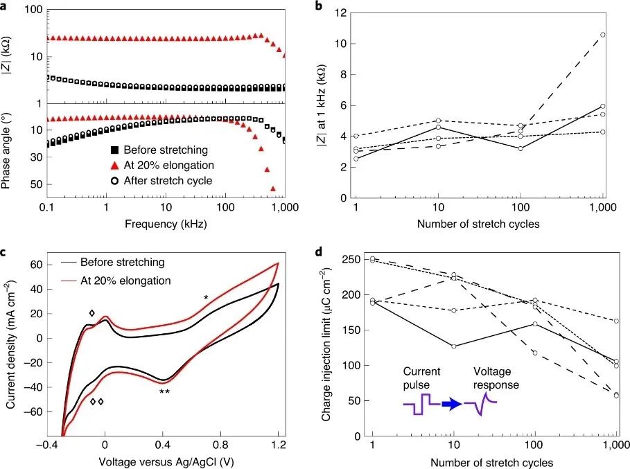 在力学性能上,硅胶和复合材料共同保证电极阵列与软组织(如硬脑膜、周围神经或肌肉)有着相似的应力-应变行为(在弹性变形的生理范围内)。在电化学上,神经打印电极的性质与尺寸相似的铂神经电极一致。机械弹性和电化学稳定性使神经打印电极适用于需要电刺激的软组织。