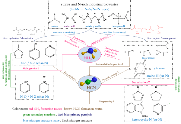 图1 典型农工业生物质热解过程源于燃料氮的大气活性氮组分形成路径图