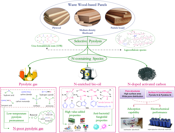 基于上述背景,近两年来,中国科学院广州地球化学研究所研究员王新明课题组聚焦氮组分含量较高的农业和工业生物质,关注与热能利用密切相关的热化学过程,对过程氮组分的演化和调控进行了一系列研究,在源端(燃烧前)控氮思路方面取得了如下认识:1、定位于热化学的基础——热解过程,解析了典型农业和工业生物质源于燃料氮转化的大气活性氮组分形成机理,明确了各组分的来源路径(如图1)。NH3和HCN既是热解过程的主要大气活性氮组分,也是后续燃烧NOx的关键前体物,过程总产率水平在20-45 wt.%范围,取决于生物质燃料氮类型(以胺、蛋白质有机氮和无机氮为体系)的热稳定性,也与热解不同阶段的过程参数条件相关。2、基于形成机理,探讨了干湿碳化预处理-热解联用手段对燃料氮到大气活性氮组分转化的调控能力。发现相比直接热解,经干湿碳化后再热解,通过碳化预处理对燃料氮官能团的去除和稳定机制,可调控热解进程中两阶段大气活性氮组分形成路径的强度,从而有效降低燃料氮到大气活性氮的转化(如图2)。进而提出分级热转化制备低氮高值燃料(燃气和炭)的技术路线(如图3)。3、基于形成机理,针对特定种类的富氮工业生物质(废弃人造板),通过综述热解过程各相氮组分特征及性能规律,提出燃料氮向固液相氮富集,进而调控其向气相氮转化的研究思路(如图4)。通过进一步的热转化研究发现,废弃人造板组分由于热稳定性差异,使三相产物之于选择性热解呈现特征化规律,体现在三相氮组分上。气相氮为大气活性氮组分,通过干法碳化预处理可有效去除;固相氮组分(杂环氮)使固相产物呈现价值化潜力,表现出良好的吸附和电化学性能。依据多类碳化方式相关试验结果,提出了一种由废弃人造板制备富氮活性炭材料的方法(如图5),通过燃料氮组分价值化利用,构成实现生物质热化学过程氮组分源端调控的新方式。该方法制备的富氮活性炭的氮保留率可高达90%以上,比表面积可至1500-1800 m2/g,对苯酚的吸附能力为500-700 mg/g,制成电极后其比电容为250-280 F/g。