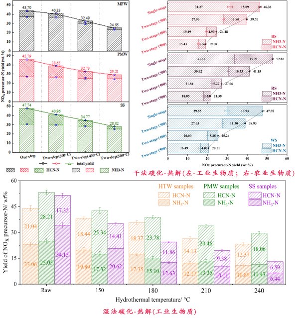 图2 干湿碳化-热解过程大气活性氮组分产率特征对比