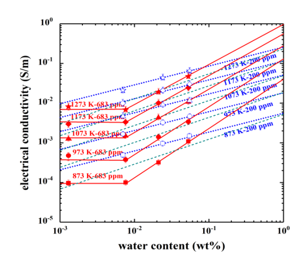 在4.0 GPa和873-1273 K条件下不同钛含量的人工合成多晶橄榄石电导率随水含量变化的的定量关系