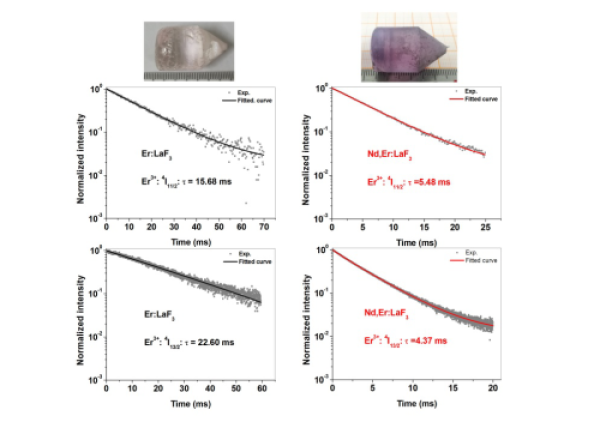 图Er:LaF3、Nd,Er:LaF3晶体及Er3+三微米激光上、下能级寿命