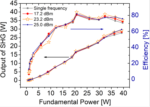 图2 单频和少频条件下,正弦射频功率分别为17.2 dB,23.2dB和25 dB时,532nm的输出和转换效率