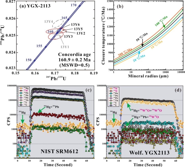 图1.(a)ID-TIMS测定YGX-2113黑钨矿标样U-Pb谐和图;(b)黑钨矿U-Pb体系封闭温度;(c & d)钨氧化物对Hg与Pb的同质异位素干扰