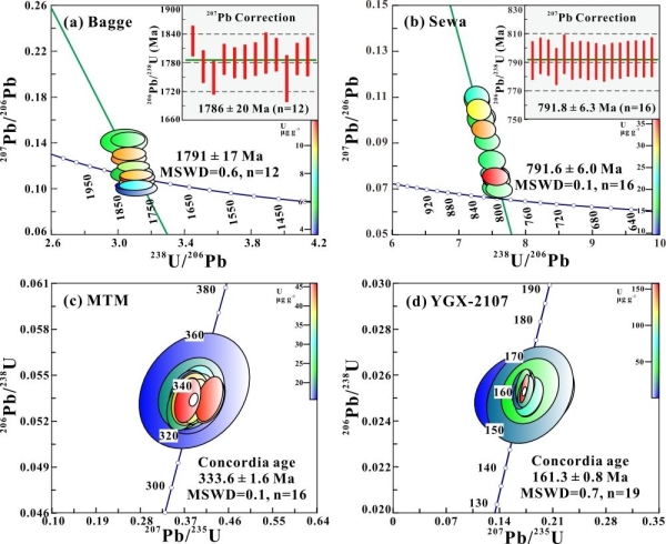 图2.LA-SF-ICP-MS测定Bagge(a)与Sewa(b)黑钨矿的T-W图解与207Pb校正的206Pb/238U年龄;以及MTM(c)与YGX-2107(d)黑钨矿U-Pb谐和图