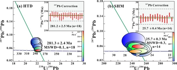 图4.LA-SF-ICP-MS测定HTD(a)和SHM(b)钨锰矿T-W图与207Pb校正206Pb/238U年龄