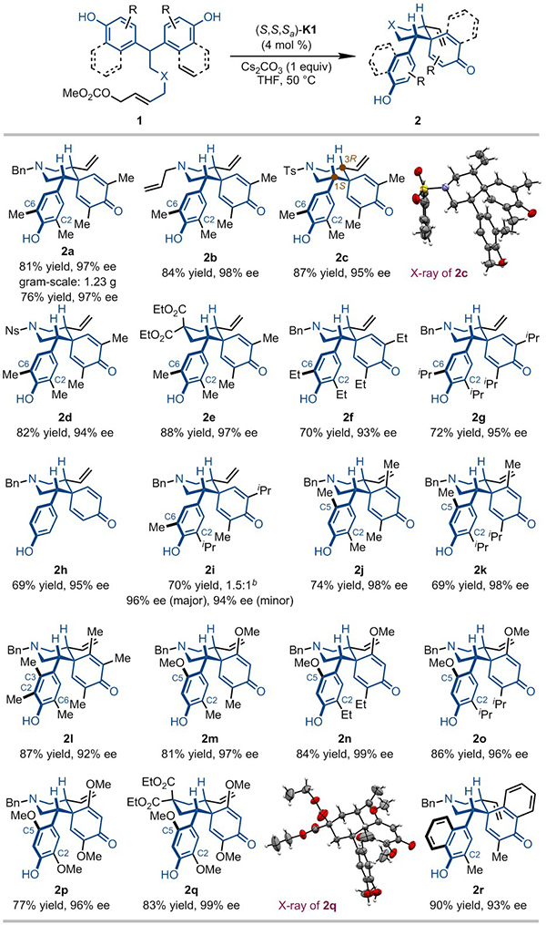 研究人员发现,在优化条件下各类含富电子取代基的双苯酚衍生物均以优秀的立体选择性得到含多个手性中心的环己二烯酮化合物,且所有反应均在30分钟内结束。反应能扩大至克级规模,收率和立体选择性不受影响。