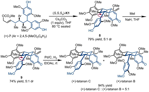 该方法可应用于天然产物tatanan B和tatanan C的合成。双苯酚前体(+)-7可在手性铱络合物(S,S,Sa)-K1的作用下发生不对称烯丙基去芳构化反应以79%的收率得到一对阻旋异构体8,后者再经过两步反应即可得到天然产物tatanan C和tatanan B的混合物(5:1),且无其他非对映异构体生成。